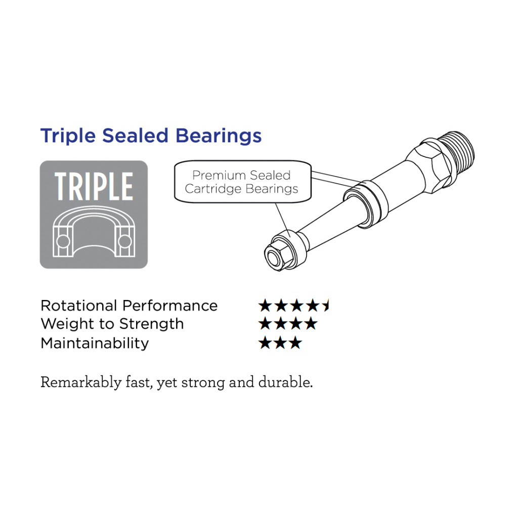 • Sylvan NEXT pedals use our Triple Sealed Cartridge Bearings- providing a remarkably smooth and maintenance-free rotation at a lighter weight than cup and cone bearings. The low drag bearing improves pedaling efficiency, making the NEXT series ideal for long distance riding.
