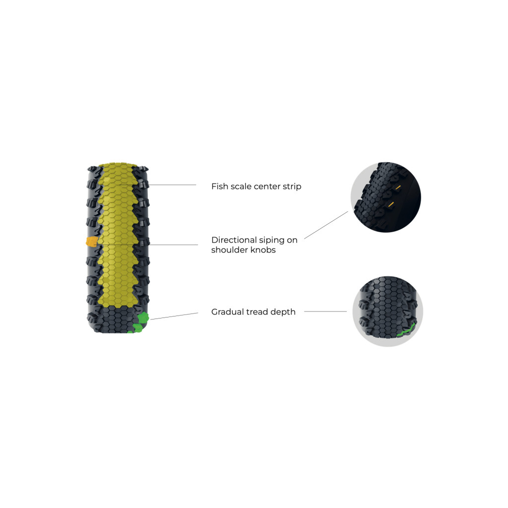 Enhanced cornering grip with siped shoulder knobs that bite into off-camber sections, while the gradual ramp-up design ensures a smooth transition when leaning into turns.