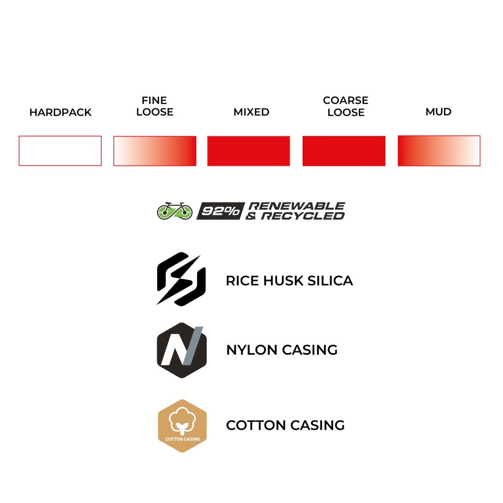 Next-generation compound blend developed specifically for competitive gravel racing, delivering exceptional speed and grip across varied terrain. Renewable and recycled ingredients include Fair-Rubber certified natural rubber, soybean oil and rice husk ash silica.